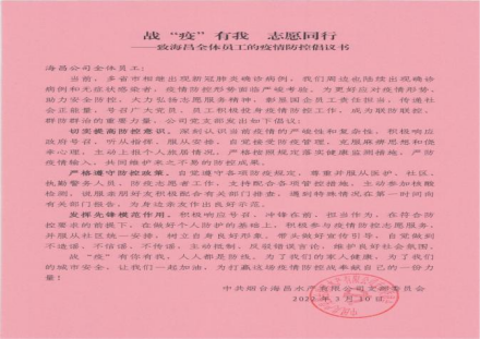 突如其来的疫情打破了人们正常的生活节奏。为打赢这场没有硝烟的战争,海昌公司党支部第一时间发出《战役有我,志愿同行》的倡议书,号召全体职工积极响应号召,冲锋在前、勇当作为。